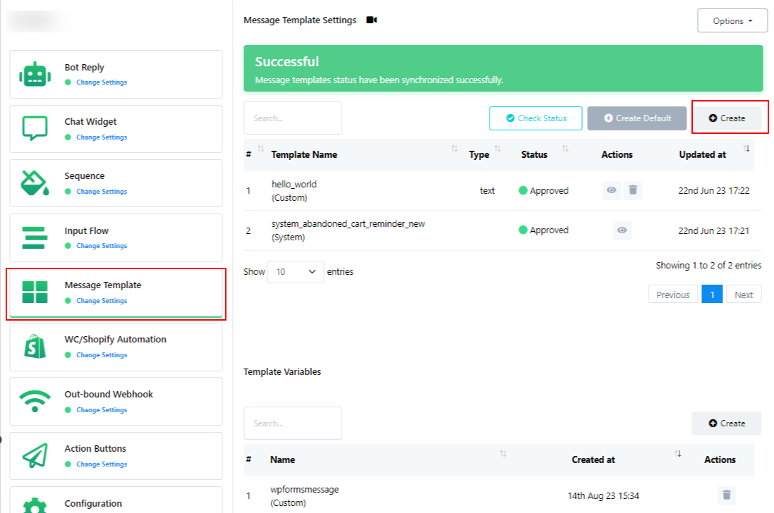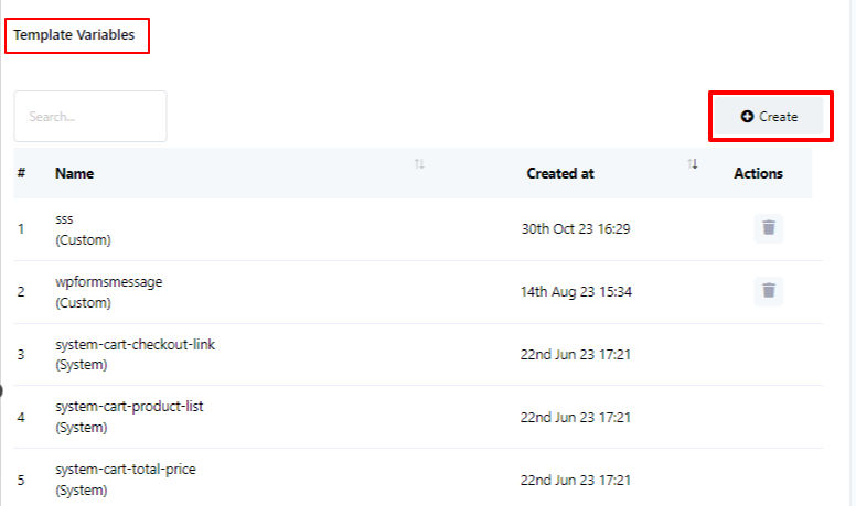 You have the option to utilize template variables from the `Template Variable` section. Additionally, if you need to create a new variable, you can do so by clicking the `Create` button within the `Template Variable` section.