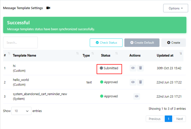 After saving, your newly created template will be listed in the Template section, but its status will initially be marked as `Submitted`. Please be aware that template approval may require some time. Once the template has been reviewed and approved, its status will be updated to `Approved`. Just check the status again to see whether they are approved or not.